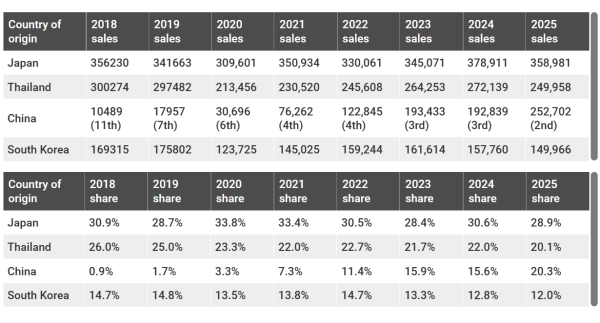 现在,在该商场中,从泰国和日本进口的新车市占率分别为20.1%和28.9%。报导称,因为我国轿车销量的增加,2025 年在澳大利亚出售的泰国和日本制作的轿车数量比上一年分别下降了8.2%和5.3%。
